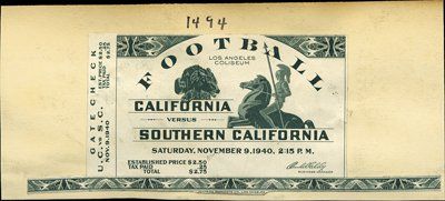 Nov.9, 1940. "Football - Los Angeles Memorial Coliseum - California Versus Southern California; Saturday Nov. 9, 1940; 2:15 PM; Est.Price $2.50 Tax Paid .25, Total $2.75 - Gate Check". Proof ticket printed in green on white thin paper mounted on manila card stock. Order or plate number "1494" on top in ink. Printed by Jeffries Banknote Co., Los Angeles. Vignette of UCLA "Bruin" bear and USC "Trojan". Famous California cross town football rivalry ticket. Unique in archive. JBNC