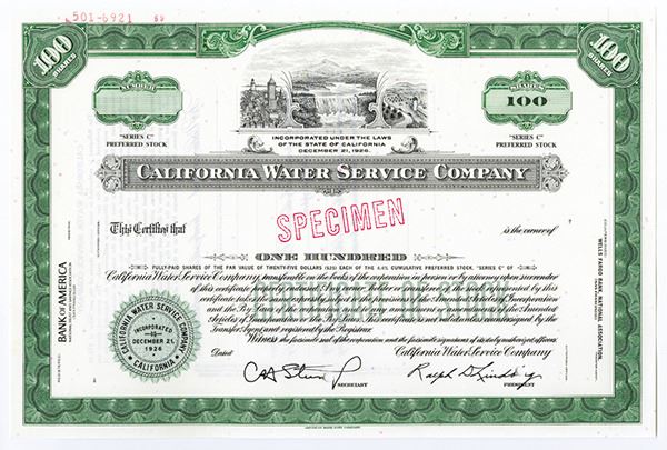 California. 100 Shares Series C 4.4% Cumulative Preferred Stock Specimen Certificate, Black print on green border and under tint, Waterfall with a city and suburb beside it, Specimen overprints and POC's, VF-XF condition, ABNC.