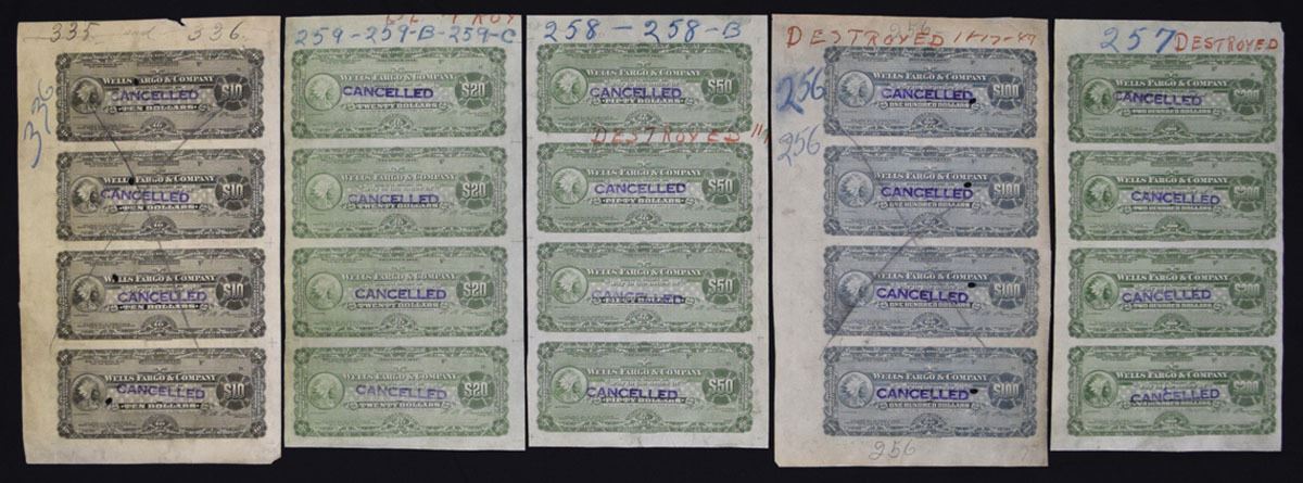 California & Worldwide, ND (1900s). Wells Fargo & Company, Lot of 5 Uncut Sheets of 4 Proof Banknotes (a total 20 Travelers Checks) printed by Republic Bank Note Company, the $10 sheet is printed in black with the balance printed in green, the obverse of each note has the same design with Native American Indian Chief at left, ornate title and text with underprint and border with different countries equivalent denominations listed on the border, Denominations include $10, $20, $50, $100, and $200 dollars, and their foreign equivalent denominations listed in the outside borders of 12 different countries, The $10 and $100 Sheets have a large crayon X across them and crayon markings claiming the sheets had been destroyed on face. The $20, $50 and $200 sheets have large purple "Cancelled" printed across the face of each note. Choice VF to AU condition. (5 sheets of 4 notes each for a total of 20 notes). All are printed on thick white paper. All were unique in this format in the ABNC archives.