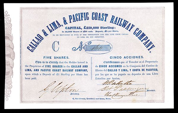 Callao & Lima, & Pacific Coast Railway, 1845. Offices at 6, Old Jewry, London, and Lima, Peru, 5 shares, blue and brown, EF.