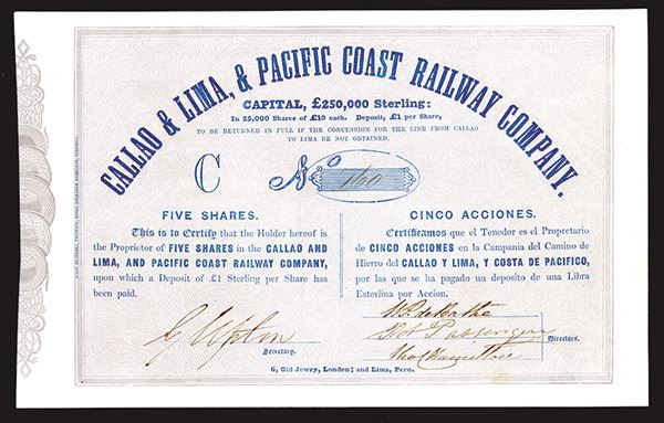 Offices at 6, Old Jewry, London, and Lima, Peru, 5 shares, blue and brown, EF. (From the collection of John E. Herzog)