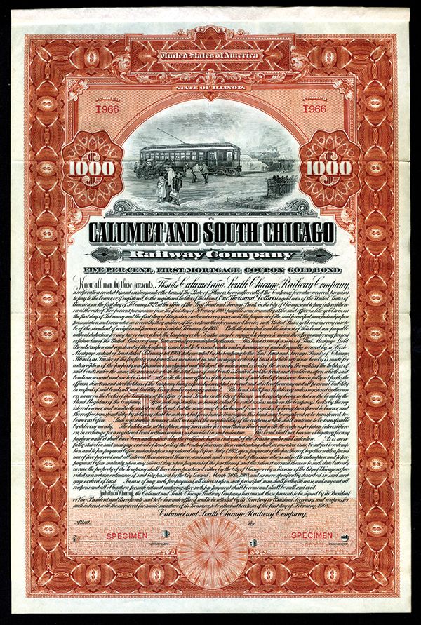 Calumet and South Chicago Railway Co., 1908 Specimen 1st Mortgage 5% Gold Coupon Bond. Chicago, Illinois, 1908, $1000, Specimen Bond, People walking in front of train, black on brown border and undertint, VF-XF, Specimen overprints, POC's, Unlisted as a specimen, with early date and as a coupon bond, only listed as a stock certificate in Cox.