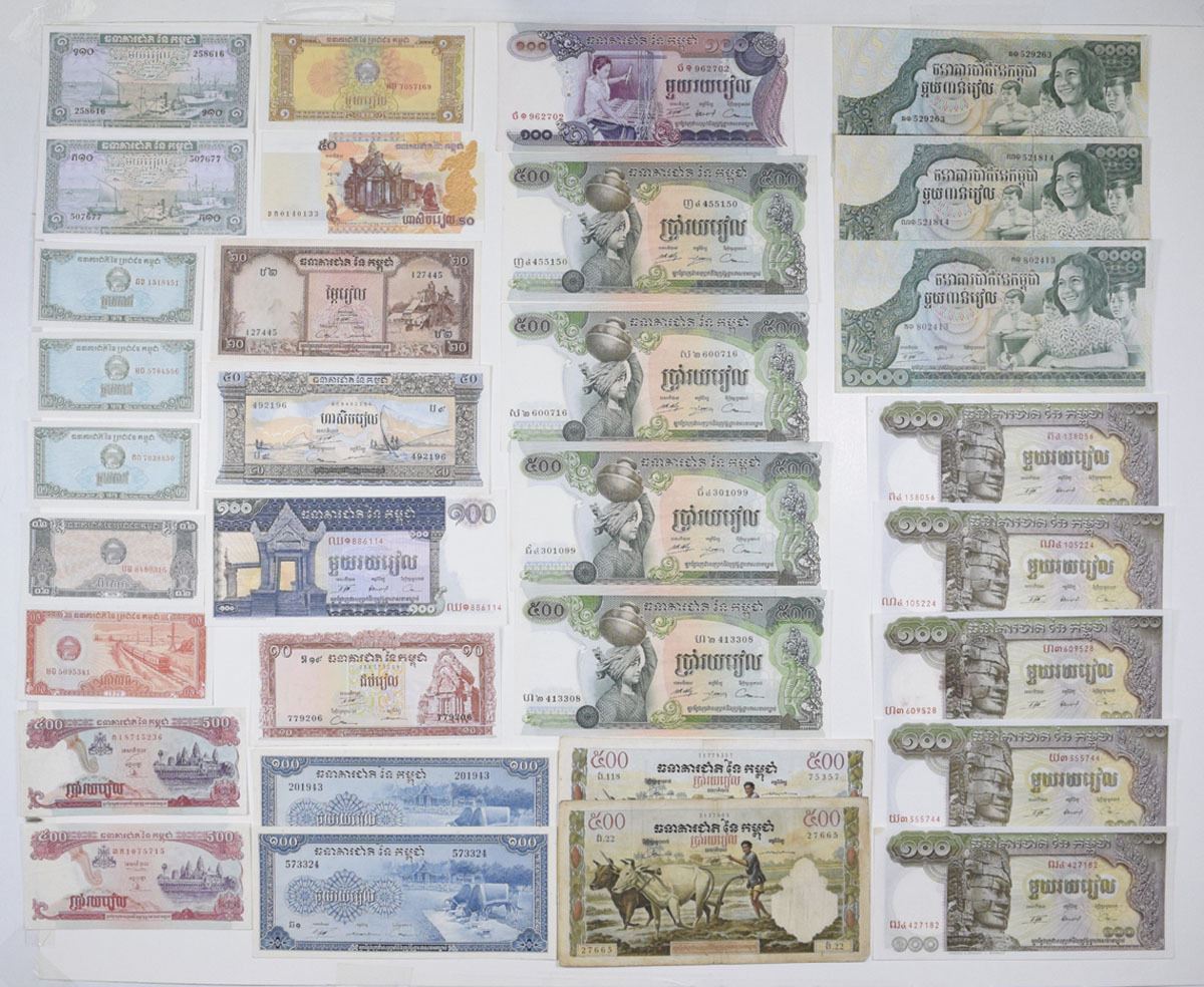 Cambodia, 1950-90s. Lot of 32 Issued Banknotes, Includes: Kingdom of Cambodia - Banque National du Cambodge, ND (1956-75), 1 Riel, P-4 (2); ND (1956-75), 20 Riels, P-5; ND (1956-75), 50 Riels, P-7; ND (1957-75), 100 Riels, P-8 (5); ND (1962-75), 10 Riels, P-11; ND (1963-72), 100 Riels, P-12; ND (1956-72), 100 Riels, P-13 (2); ND (1958-70), 500 Riels, P-14 (2); Khmer Republic - Banque Nationale du Cambodge, ND (1973), 100 Riels, P-15; ND (1973-75), 500 Riels, P-16 (4); ND (1973) 1000 Riels, P-17 (3); State Bank of Democratic Kampuchea, 1979, 0.1 Riel (1 Kak), P-25a (3); 1979, 0.2 Riel (2 Kak), P-26a; 1979, 0.5 Riel (5 Kak), P-27a; 1979, 1 Riel, P-28a; National Bank of Cambodia, 1996-98, 500 Riels, P-43 (2); 2002, 50 Riels, P-52a. Notes range from Choice VF to mostly Choice AU to CU condition. (32). Sold "AS IS" no returns accepted.