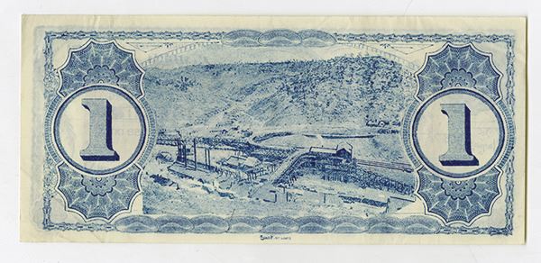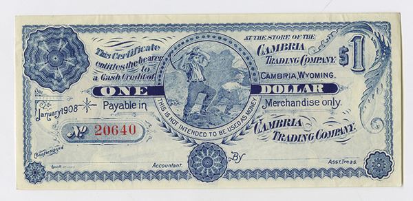 Cambria, WY. $1, Remainder scrip. Miners in middle, back with image of mine, AU condition, Gast, St. Louis.