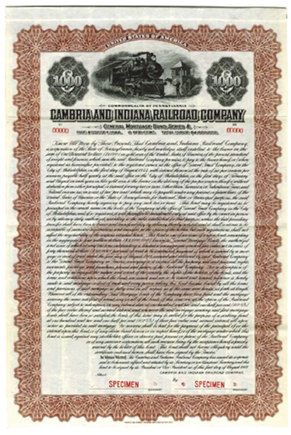 Pennsylvania. $1000 Specimen 6% Series A General Mortgage Coupon Bond, Black print on brown border and under tint, Locomotive at top passing signal man, Specimen overprints and POC's, Fine-VF condition, FL-ABNC.