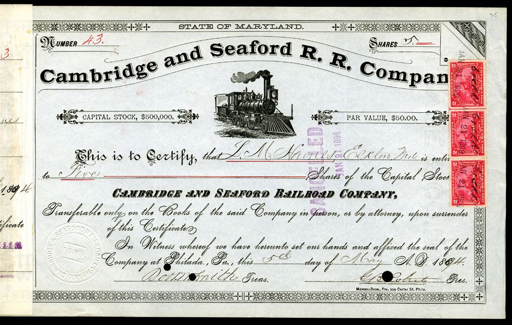 Maryland (Inc. Philadelphia, PA), 5 Shares, I/C, locomotive L-R, stamps on right. VF.
