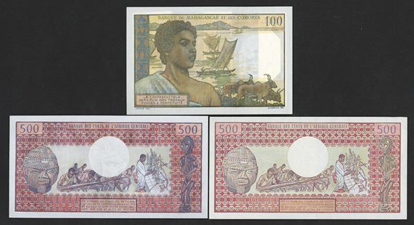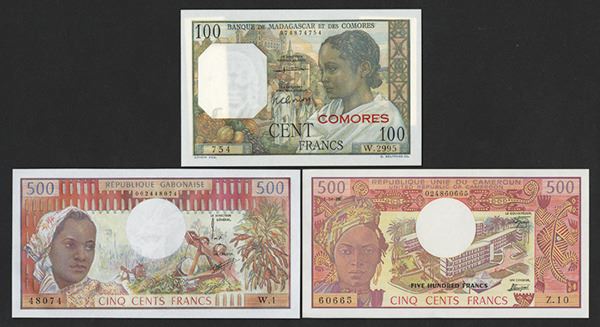 500 Francs P-15c 1.4.1978 Red brown and m/c. Woman's bust at left, aerial view of modern buildings at enter. Mask at left, students chemical testing at center on back. Choice Unc. Comoros, Banque de Madagascar et des Comoros Provisional Bank Note Issue 100 Francs P-3b ND(1963) m/c. Woman at right. Woman at left, boats at center on back. Unc, Gabon, Banque des Etats de l'Afrique 500 Francs P-2a ND(1974) Lilac brown on m/c under print. Woman at left, logging at center right. Mask at left, students chemical testing at center on back. Unc. Three very nice interesting issued bank notes.