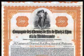 1922, $500 Paris-Lyons Mediterranean Railroad Company, 6% external sinking fund gold bond. Orange border with allegorical female vignette. ABNCo. Specimen with coupons, EF, Extremely attractive French railroad bond.