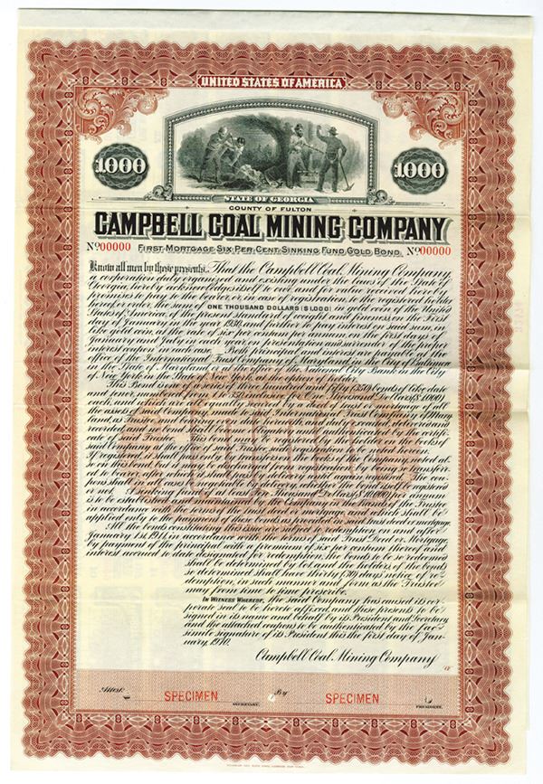 Georgia. $1000 Specimen 6% 1st Mortgage Sinking Fund Gold Coupon Bond, Black print on brown border and under tint, Men in mine at top, Specimen overprints and POC's, VF-XF condition, FL-ABNC.