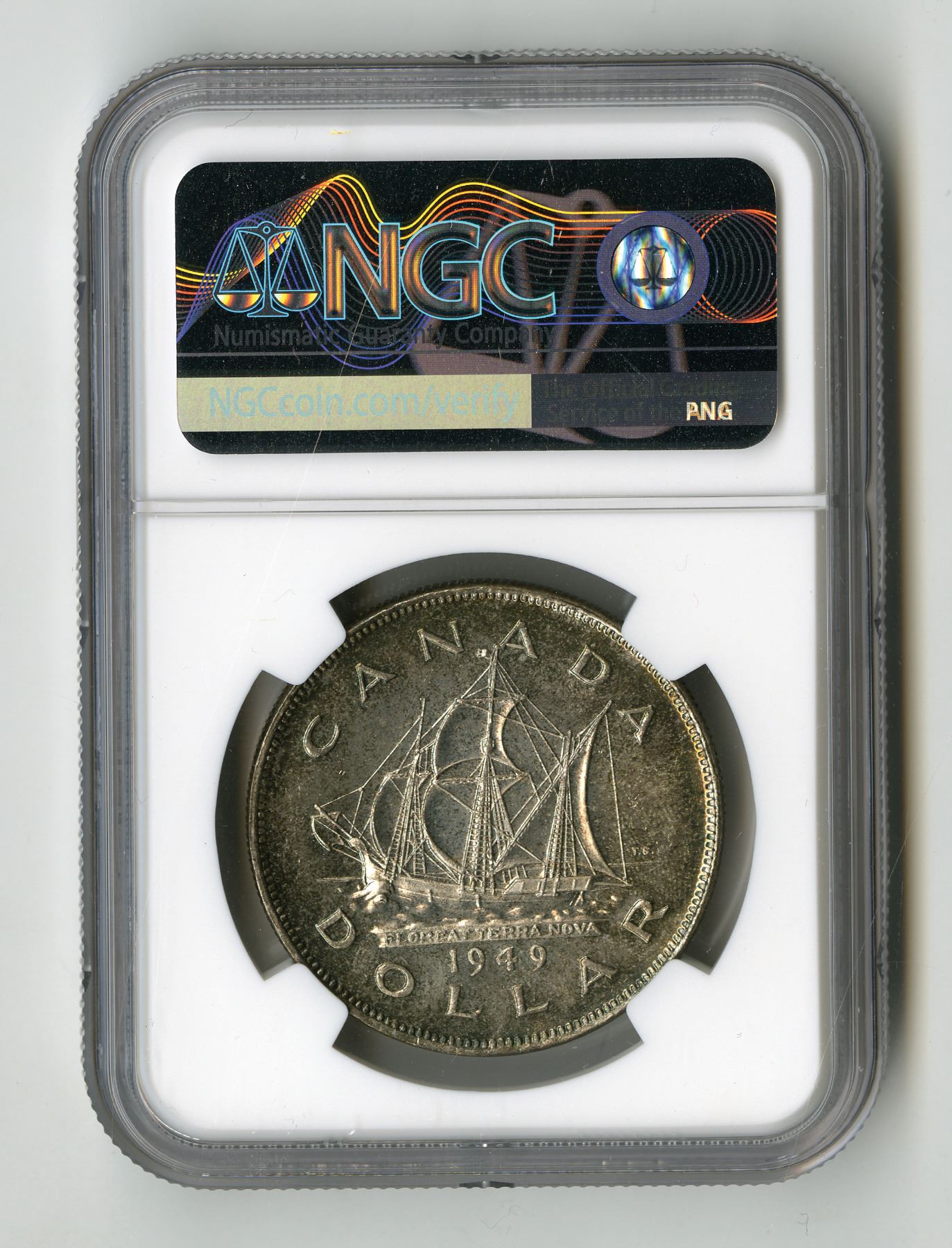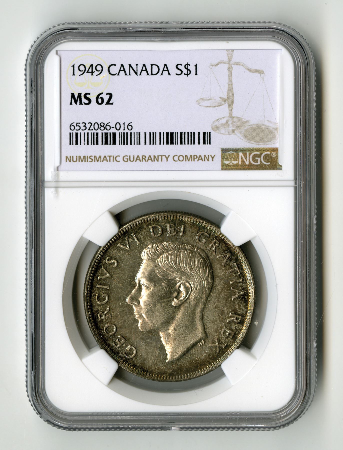 Canada: 1 Dollar, 1949; KM-47, silver, Royal Canadian Mint. NGC MS 62. Circulating commemorative King George VI coin celebrating the Accession of Newfoundland to Canada: