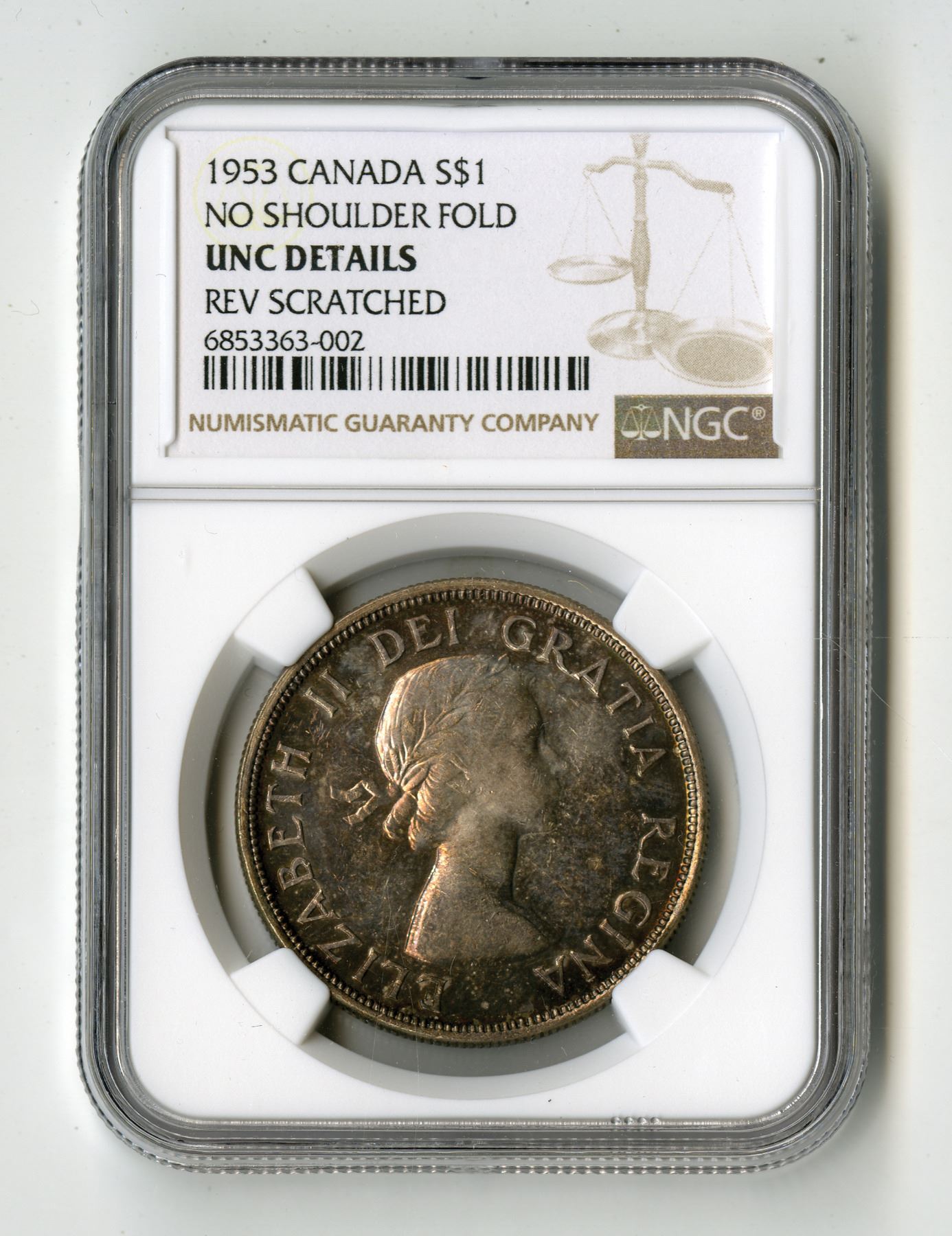 Canada: 1 Dollar, 1959; KM-54, silver, Royal Canadian Mint. NGC Unc Details with comment "Reverse Scratched". Queen Elizabeth II. Lots of attractive toning.