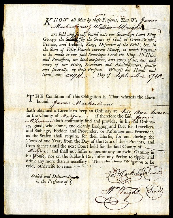 Halifax, (Canada), September 20, 1762. Issued 50 Pounds current money, Tavern & Lodging House License from Sovereign Lord King George the (Second Crossed out and Third written in) of Great-Britain, France and Ireland, to James Mackandrew and William Wright to keep at his own house ....good, wholesome and cleanly Lodging and Diet for Travelers, and Stablage, Fodder and Provender, or Pasturage and Provender, as Season shall require for their Horses......and shall not suffer or permit any unlawful Gaming in his house, nor on Sabbath Day suffer any Person to Tipple and drink more than is necessary”. It is signed by both Mackandrew and Wright on bottom. Some toning and foxing of the document, ink stains in a couple of small areas and ink burn on a couple small spots, but otherwise, the document is in excellent condition. Rare early License for Lodging and Drinking Tavern in the Colonies.