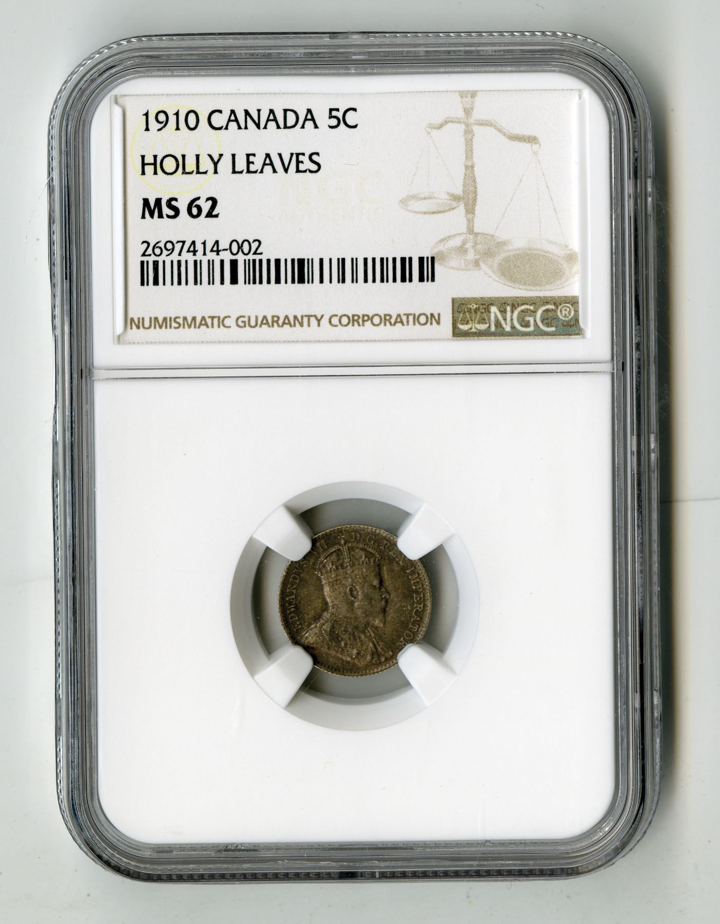 Canada: 10 Cents, 1910; KM-3, Royal Canadian Mint. NGC MS 62. King George V. Holly leaves variety. Dark toned with attractive lustre.