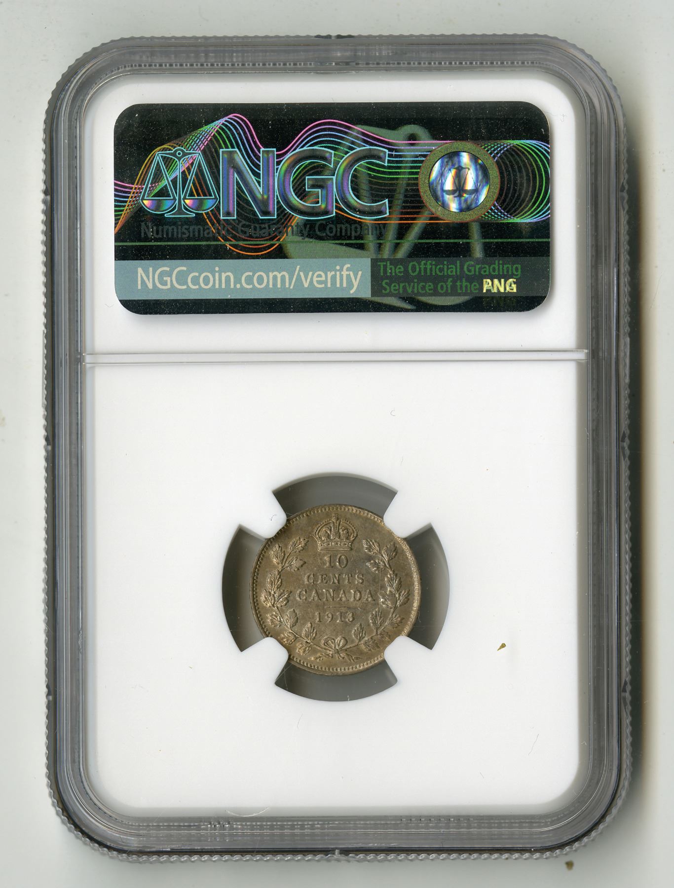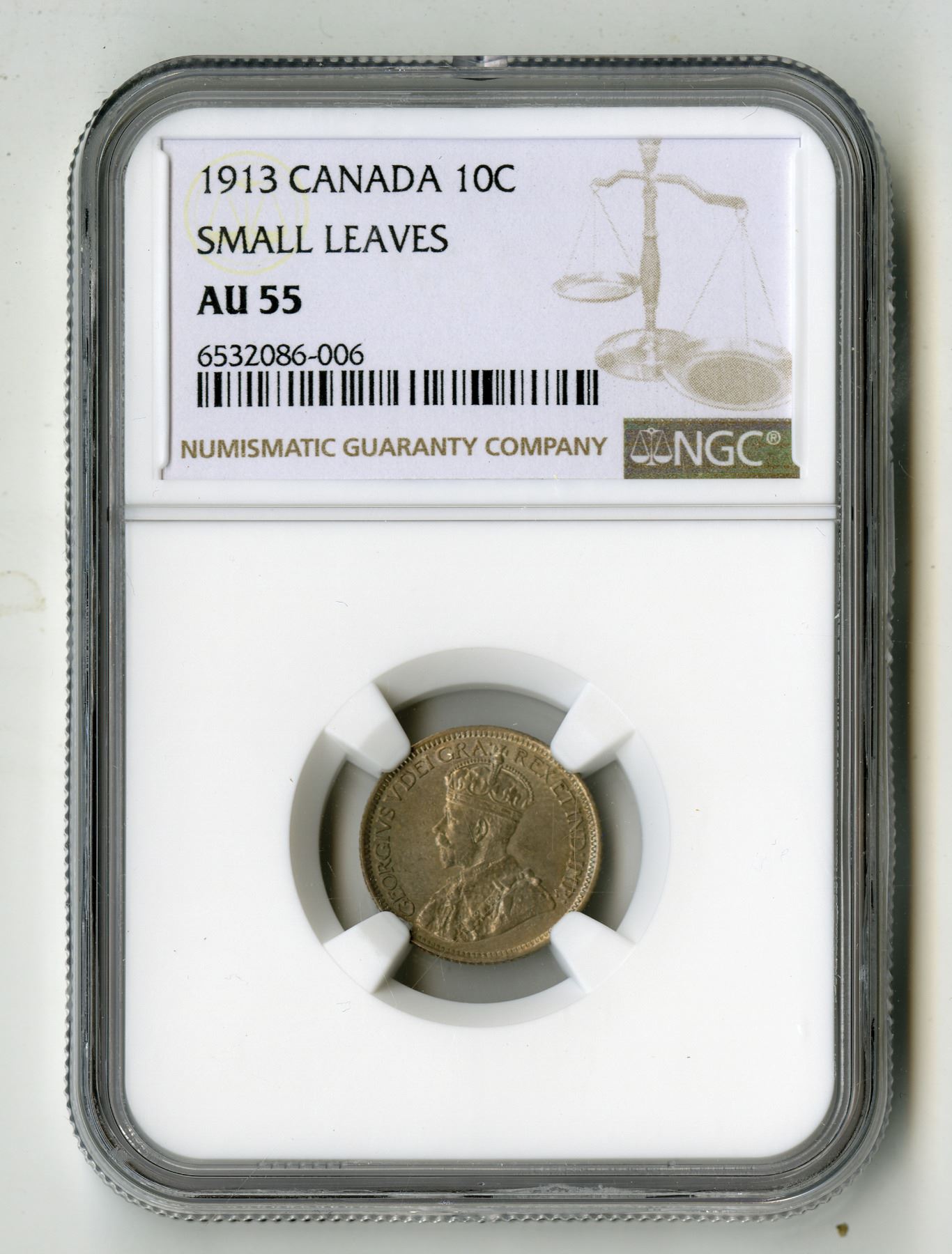 Canada: 10 Cents, 1913; KM-3, silver, Royal Canadian Mint. NGC AU 55. King George V. Small leaves variety. Superb and underrated lustrous specimen.