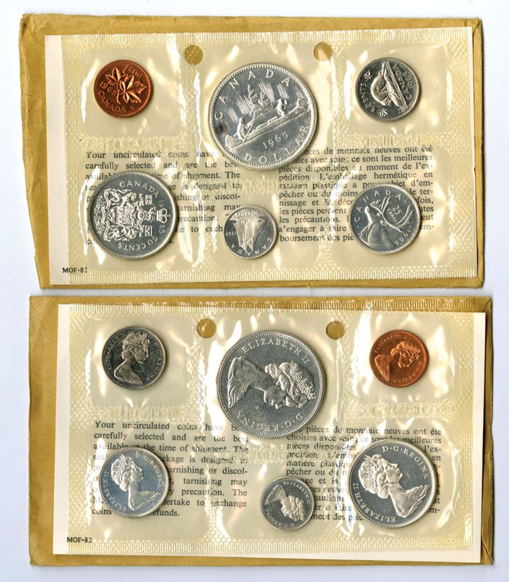 Canada, 1965. Lot of 2 Official Royal Canadian Mint Uncirculated Coin Sets, each containing six coins sealed in original mint cellophane packaging plus envelope with information card. Silver, 0.800 Fineness; ASW - 1.1 troy ounce for each set, Each set includes the 1 Cent (Maple Leaf) in Bronze, 5 Cents (Beaver) in Nickel, 10 Cents (Bluenose Schooner) in Silver, 25 Cents (Caribou) in Silver, 50 Cents (Canadian Coat of Arms) in Silver, and 1 Dollar (Voyageur in Silver), all bearing the young portrait of Queen Elizabeth II. Coins remain in Brilliant Uncirculated condition within original mint packaging. Total silver content (ASW): 1.11 troy oz per set; 2.22 troy oz total for both sets. (2 sets, 12 coins total). Silver Melt as of 3-14-26 is $89. Sold “AS IS” no returns accepted.