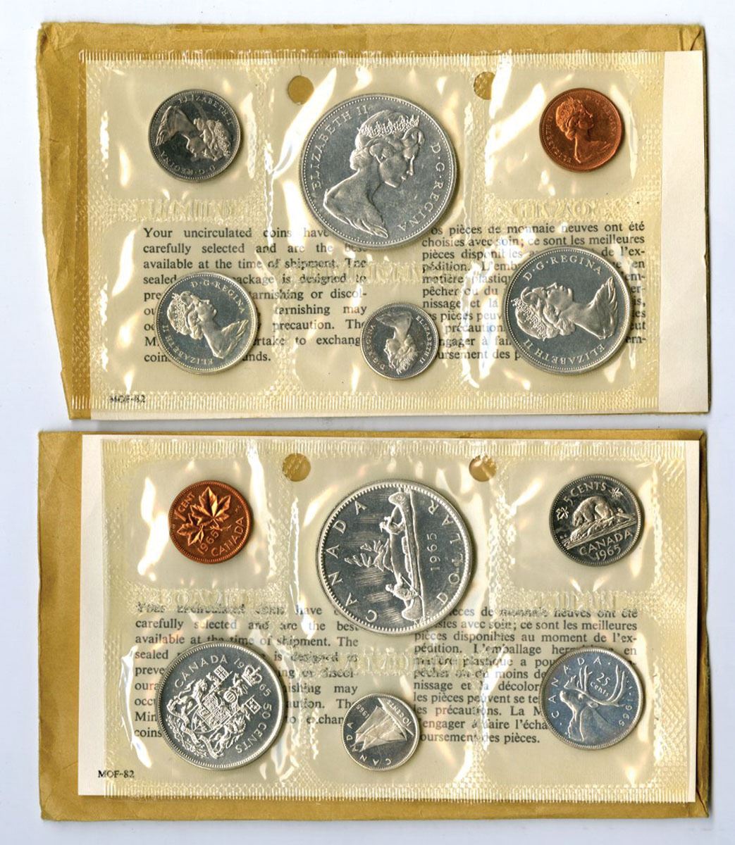 Canada, 1965. Lot of 2 Official Royal Canadian Mint Uncirculated Coin Sets, each containing six coins sealed in original mint cellophane packaging plus envelope with information card. Silver, 0.800 Fineness; ASW - 1.1 troy ounce for each set, Each set includes the 1 Cent (Maple Leaf) in Bronze, 5 Cents (Beaver) in Nickel, 10 Cents (Bluenose Schooner) in Silver, 25 Cents (Caribou) in Silver, 50 Cents (Canadian Coat of Arms) in Silver, and 1 Dollar (Voyageur in Silver), all bearing the young portrait of Queen Elizabeth II. Coins remain in Brilliant Uncirculated condition within original mint packaging. Total silver content (ASW): 1.11 troy oz per set; 2.22 troy oz total for both sets. (2 sets, 12 coins total). Silver Melt as of 3-14-26 is $89. Sold “AS IS” no returns accepted.