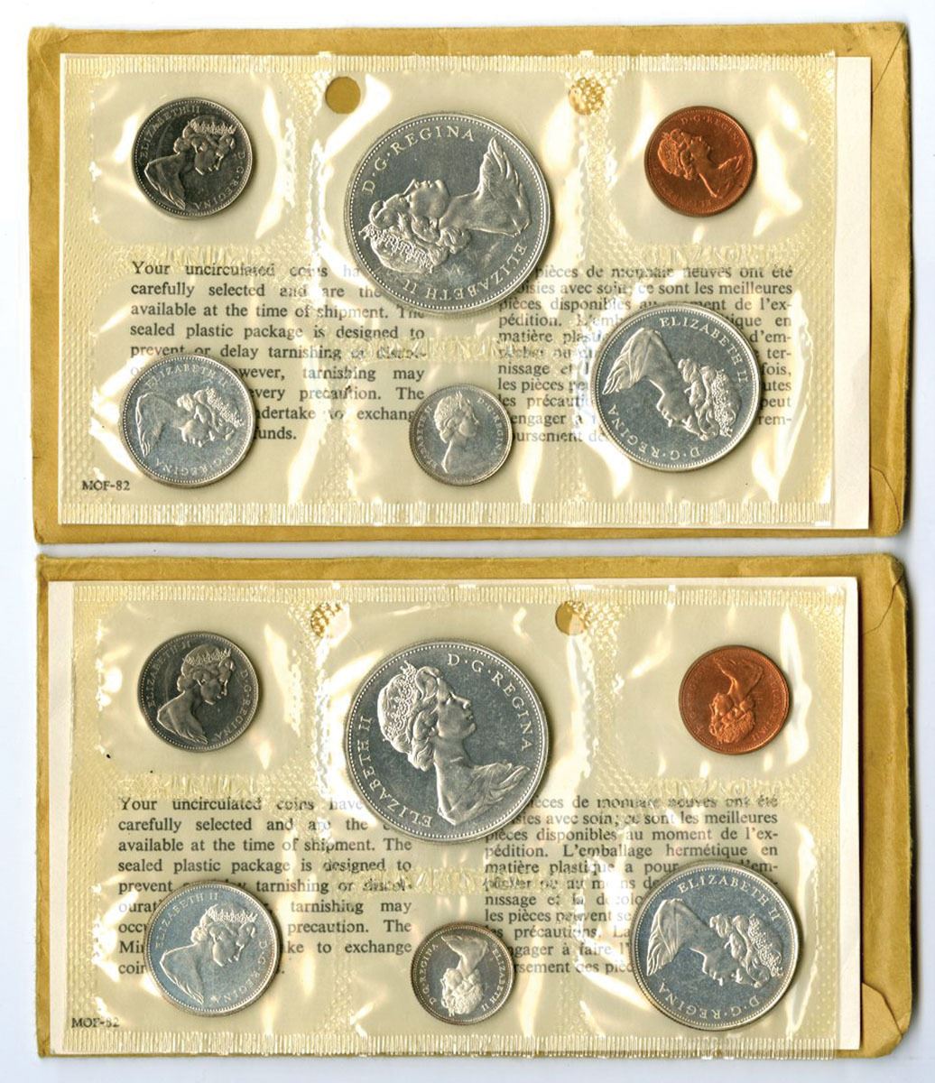 Canada, 1965. Lot of 2 Official Royal Canadian Mint Uncirculated Coin Sets, each containing six coins sealed in original mint cellophane packaging plus envelope with information card. Silver, 0.800 Fineness; ASW - 1.1 troy ounce for each set, Each set includes the 1 Cent (Maple Leaf) in Bronze, 5 Cents (Beaver) in Nickel, 10 Cents (Bluenose Schooner) in Silver, 25 Cents (Caribou) in Silver, 50 Cents (Canadian Coat of Arms) in Silver, and 1 Dollar (Voyageur in Silver), all bearing the young portrait of Queen Elizabeth II. Coins remain in Brilliant Uncirculated condition within original mint packaging. Total silver content (ASW): 1.11 troy oz per set; 2.22 troy oz total for both sets. (2 sets, 12 coins total). Silver Melt as of 3-14-26 is $89. Sold “AS IS” no returns accepted.