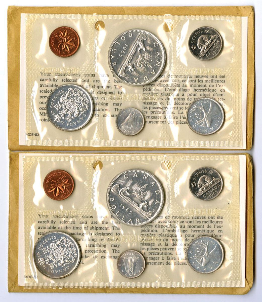 Canada, 1965. Lot of 2 Official Royal Canadian Mint Uncirculated Coin Sets, each containing six coins sealed in original mint cellophane packaging plus envelope with information card. Silver, 0.800 Fineness; ASW - 1.1 troy ounce for each set, Each set includes the 1 Cent (Maple Leaf) in Bronze, 5 Cents (Beaver) in Nickel, 10 Cents (Bluenose Schooner) in Silver, 25 Cents (Caribou) in Silver, 50 Cents (Canadian Coat of Arms) in Silver, and 1 Dollar (Voyageur in Silver), all bearing the young portrait of Queen Elizabeth II. Coins remain in Brilliant Uncirculated condition within original mint packaging. Total silver content (ASW): 1.11 troy oz per set; 2.22 troy oz total for both sets. (2 sets, 12 coins total). Silver Melt as of 3-14-26 is $89. Sold “AS IS” no returns accepted.