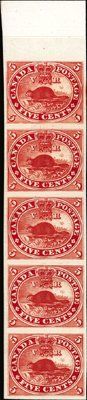 1859. Unitrade #15TCii. Top margin vertical strip of five in brown red on india paper mounted on card, Extremely Fine.