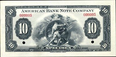 1910-1950. 10 Uniface specimen or proof of rare advertising note from ABNC. Top line text has "EXPERIMENT". Allegorical man turns "Wheel of Progress". No undertint. Red "000005" serial number. Back has printed "Proof of Specimen Steel Engraved Bank Note Used For Motion Picture Film". POC. Tape mounting remnant on back of left margin. Unc. Condition. Very rare. ABNC.