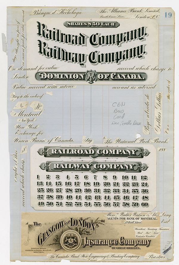 Montreal & Quebec, Canada. Lot of 2 Vignette sample sheets that were arranged artistically and include multiple proof vignettes printed on india paper, thin card and regular paper and arranged on blue ruled paper 10x15 inches. Includes titles, headings , text used on certificates and documents, Letter head samples, and ornate cycloid borders arranged artfully on a similar page. Printed by the "Canada Bank Note Engraving and Printing Company (CBNEP)" also known as "The Canada Bank Note Co.", Montreal. The Canada Bank Note Company, chartered in 1882, had William C. Smillie as president. Rare proof from this early Canadian printing company that only lasted a little over 12 years.