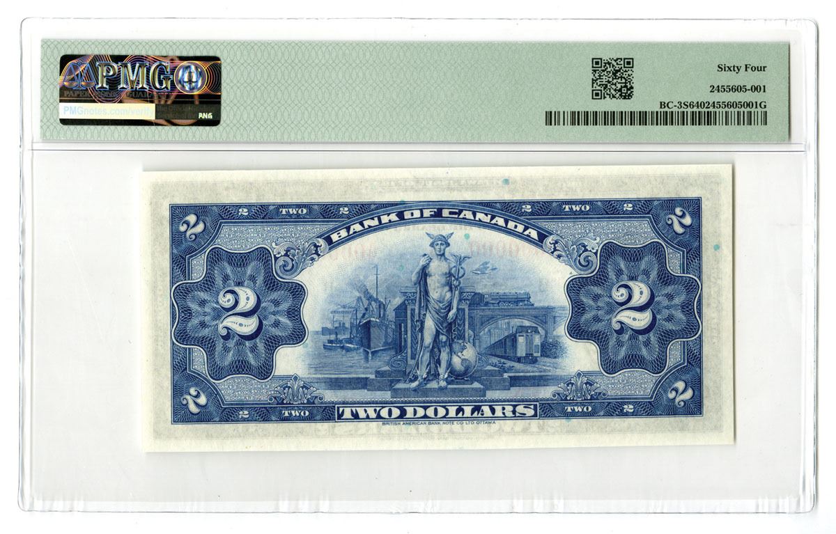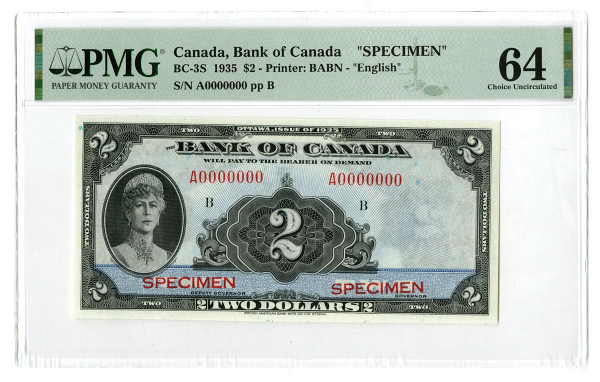Canada, 1935. Bank of Canada, 2 Dollars, P-40s, BC-3S, Specimen Banknote, Ottawa issue of 1935, English text only, Black on blue underprint with Portrait of Queen Mary at left, Back is blue with Mercury standing with various modes of transportation at center, Red Specimen overprints, S/N A0000000 pp B, PMG graded Choice Uncirculated 64, but the nearly perfect centering and 4 large, even margins as well as the bright fresh appearance only adds to this lovely notes desirability as well as giving the appearance of a Superb Gem Uncirculated example, printed by the British American Bank Note Company, Ottawa. This rare note represents an important and highly collectible example from the first Bank of Canada issue marking the transition from chartered bank notes to a centralized national currency system in 1935.