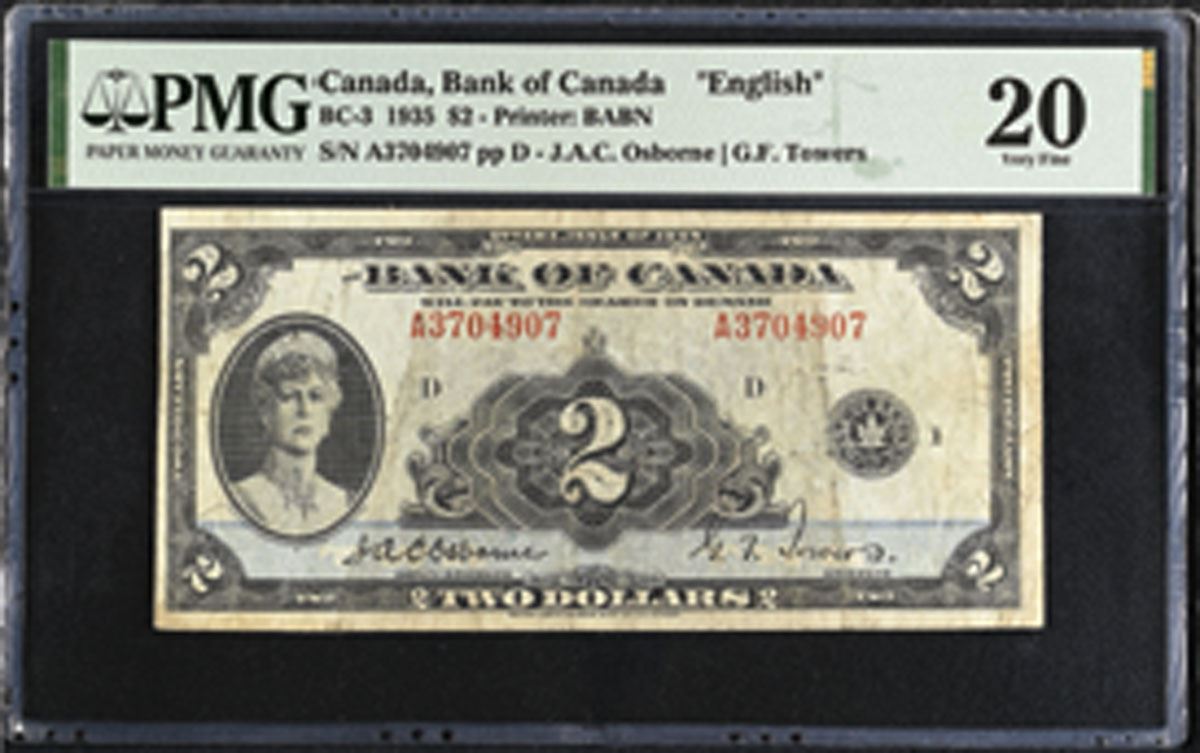 Ottawa, Canada, 1935. 2 Dollars, P-40, BC-3, Issued Banknote, Black on blue underprint with Portrait of Queen Mary at left, English text, Back is blue with Mercury/Hermes at center, S/N A3704907 pp D, PMG graded Very Fine 20 with comment "Stained," BABN.