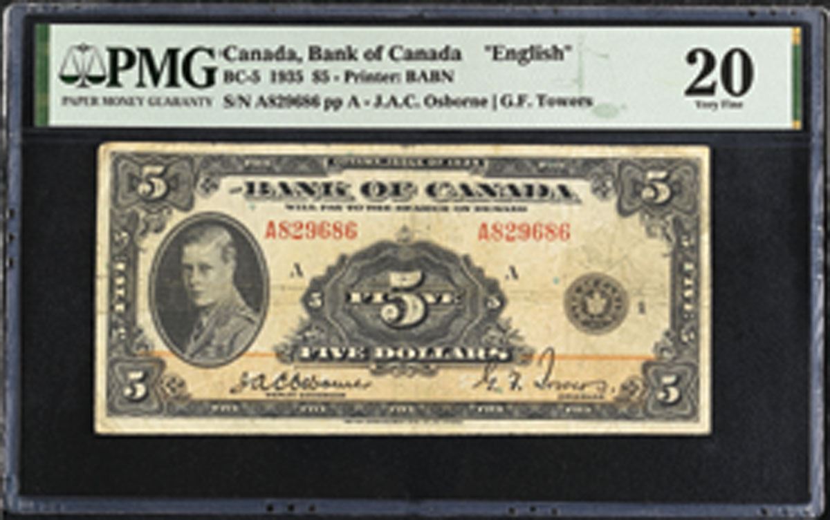 Ottawa, Canada, 1935. 5 Dollars, BC-5, P-42, Issued Banknote, Black on orange underprint with portrait of Edward Prince of Wales left, English printed note, Back is orange with Electric Power at center, S/N A829686 pp A, PMG graded Very Fine 20, BABN.