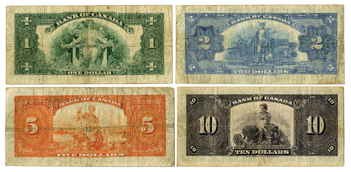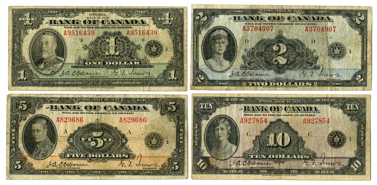 Canada....., 1935. Lot of 4 Issued Banknotes, Includes: 1 Dollar, P-38, Black on green underprint with King George V at left, CBNC; 2 Dollars, P-40, Black on blue underprint with Queen Mary at left, BABNC; 5 Dollars, P-42, Black on orange underprint with Edward - Prince of Wales at left, BABNC; 10 Dollars, P-44, Black on purple underprint with Princess Mary at left, BABNC. Notes range from Fine to VF+ condition. (4). Sold "AS IS" no returns accepted.