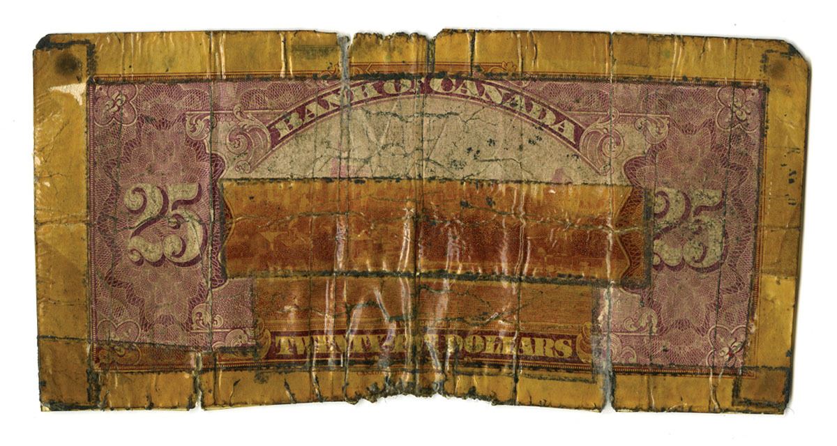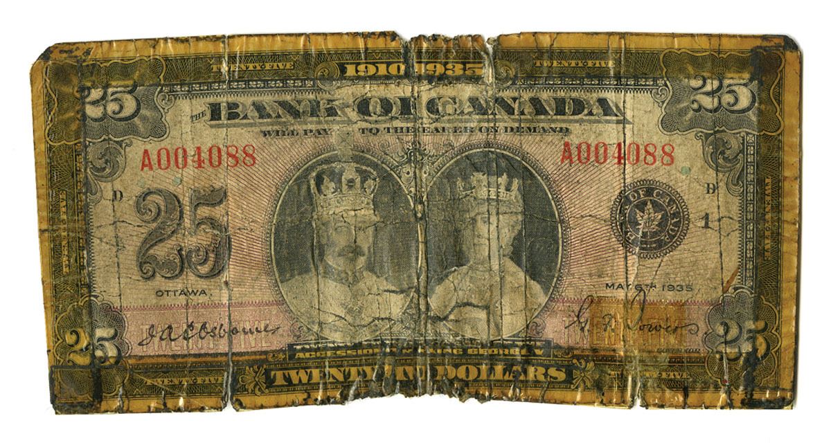 Canada, 1935. 25 Dollars, P-48, Issued Commemorative Banknote, Black on purple underprint with King George V and Queen Mary at center, Back is purple with Windsor Castle at center, S/N A004088, Repaired and in poor condition with extensive Scotch tap repairs where the note was torn, ripped or damaged, but an excellent space filler which is missing from a vast majority of collections, CBNC.
