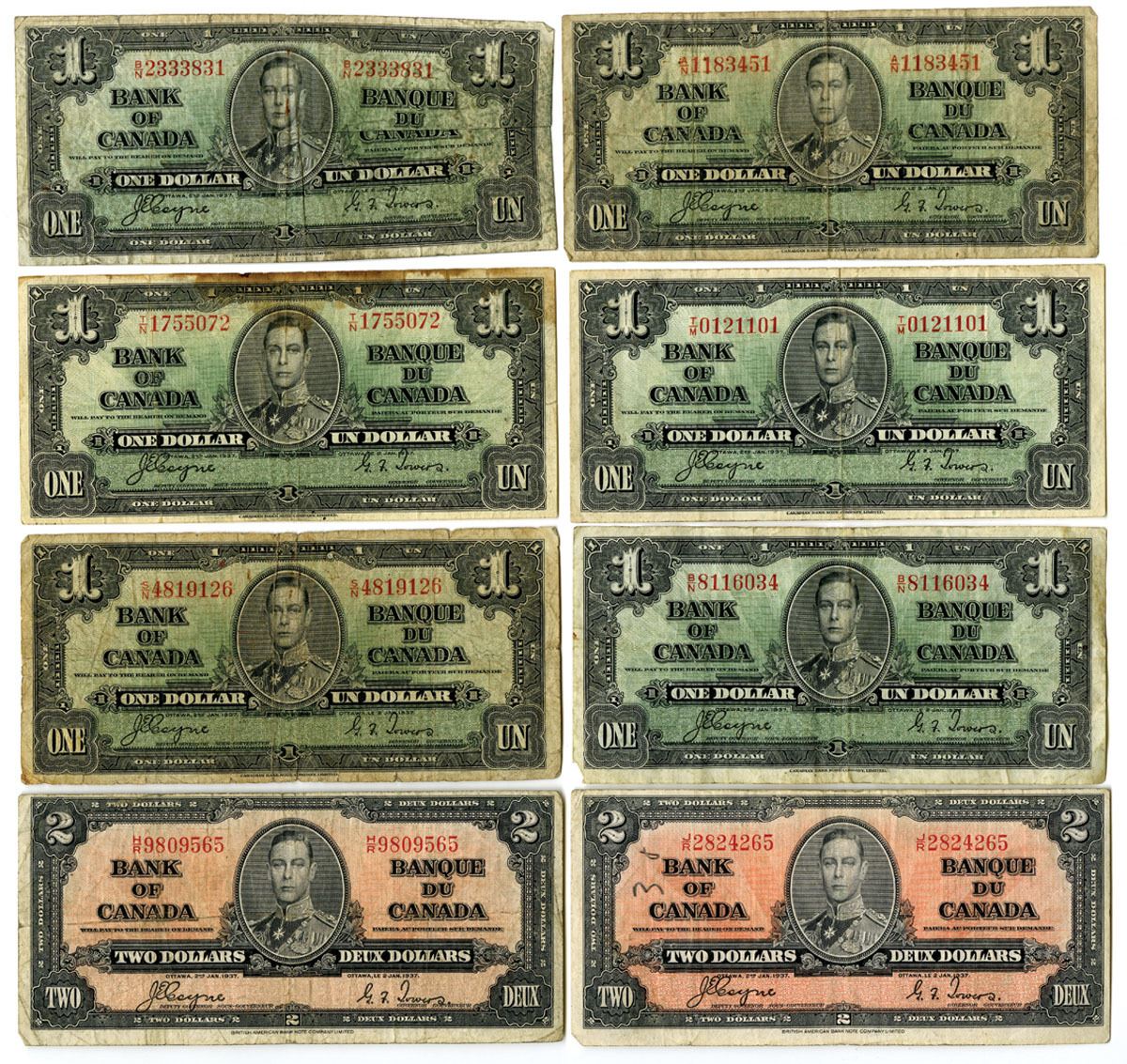 Canada, 1937. Lot of 8 Issued Banknotes, Includes: 1 Dollar, P-58e (6), CBNC; 2 Dollars, P-59c (2), BABNC. Notes range from Fine to VF condition. (8). Sold "AS IS" no returns accepted.