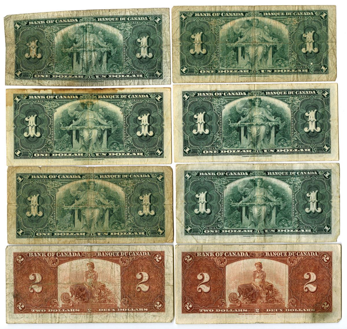 Canada, 1937. Lot of 8 Issued Banknotes, Includes: 1 Dollar, P-58e (6), CBNC; 2 Dollars, P-59c (2), BABNC. Notes range from Fine to VF condition. (8). Sold "AS IS" no returns accepted.