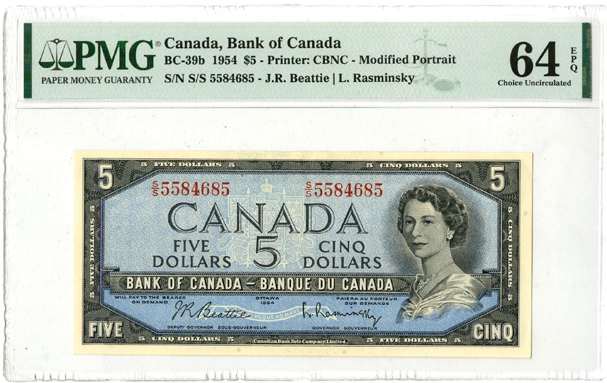 Canada, 1954. $5 Dollars, P-77b BC-39b, Issued Banknote, Black on blue underprint with modified portrait of Queen Elizabeth II at right, Back is blue with river in the north country at center, S/N S/S 5584685, PMG graded Choice Uncirculated 64 EPQ, CBNC.