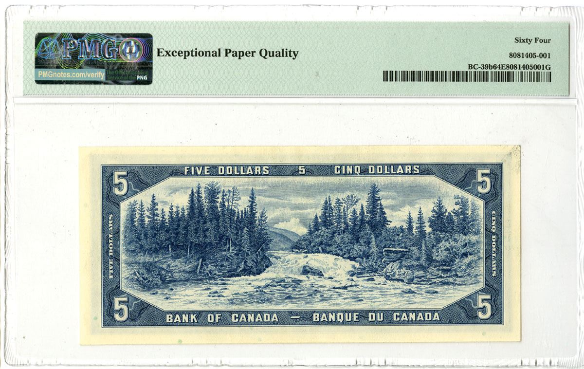 Canada, 1954. $5 Dollars, P-77b BC-39b, Issued Banknote, Black on blue underprint with modified portrait of Queen Elizabeth II at right, Back is blue with river in the north country at center, S/N S/S 5584685, PMG graded Choice Uncirculated 64 EPQ, CBNC.
