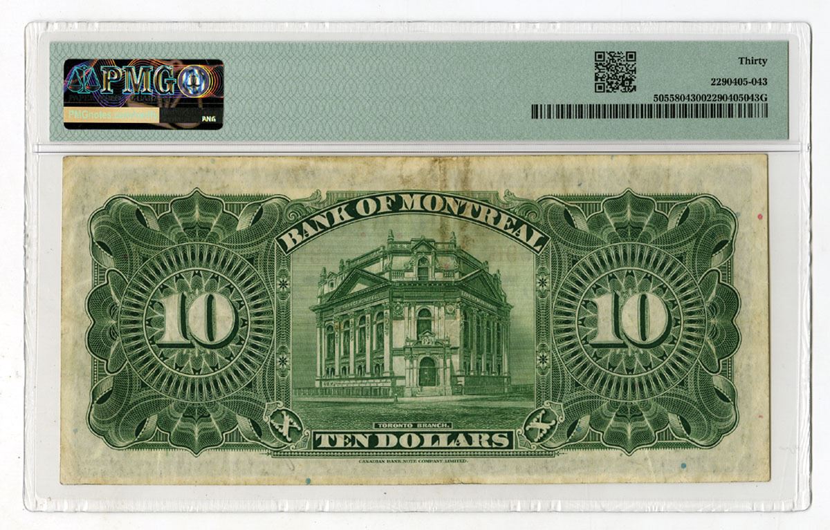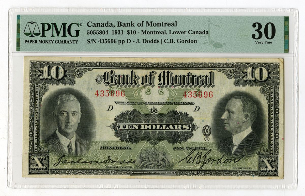 Canada, 1931. 10 Dollars, P-S554 5055804, Issued Banknote, Black on olive-green underprint, Portrait of J. Dodds at left, bank crest at bottom center, and portrait of C. B. Gordon in profile at right, Back is green with Toronto Branch Office building at center, S/N 435696 pp D, PMG graded Very Fine 30, CBNC