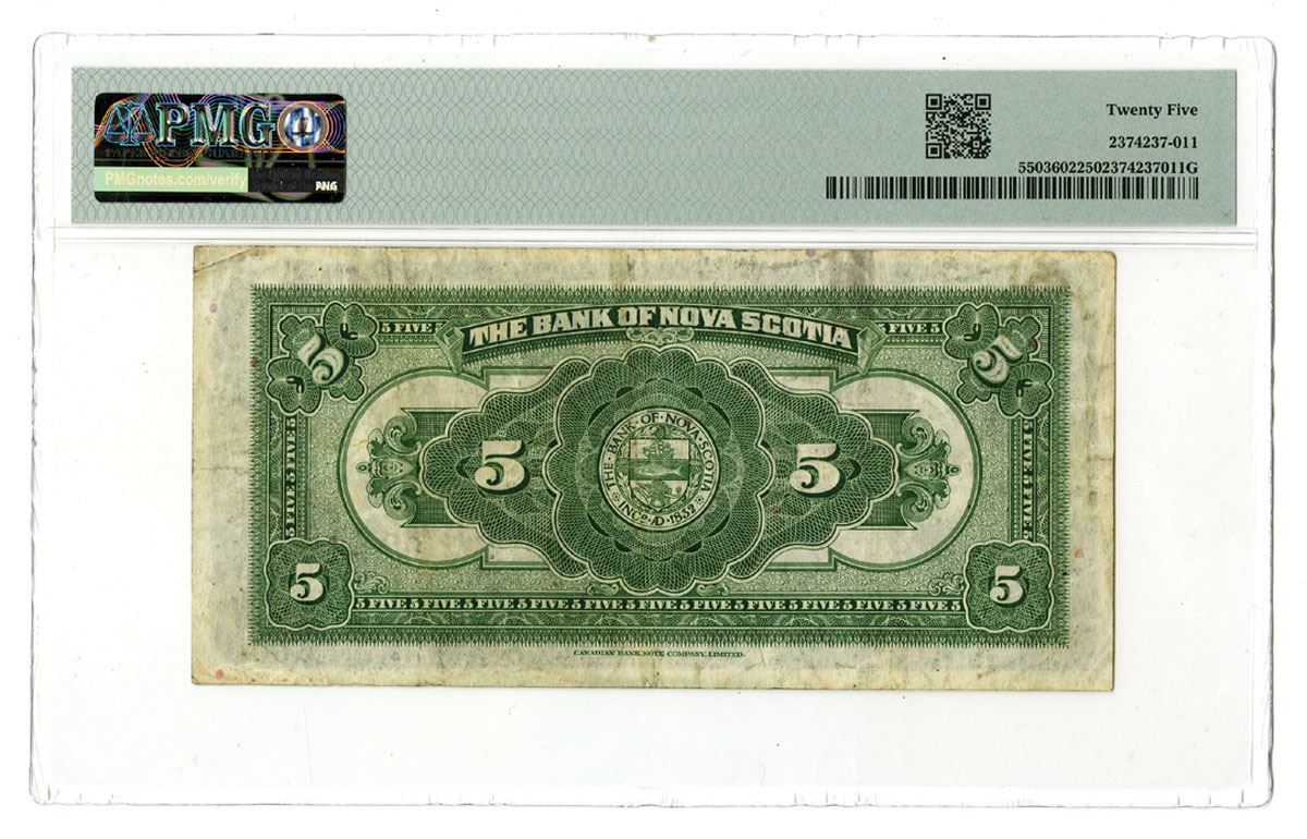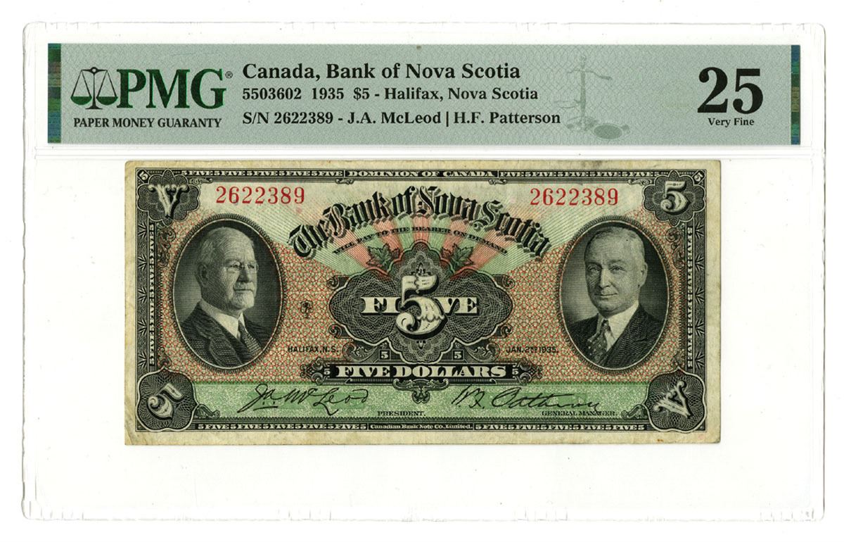 Nova Scotia, Canada, 1935. 5 Dollars, P-S632 5503602, Issued Banknote, Black on red and green underprint with portrait of J.A. McLeod at left and H.F. Patterson at right, Back is green with bank seal at center, S/N 2622389, PMG graded Very Fine 25, CBNC.
