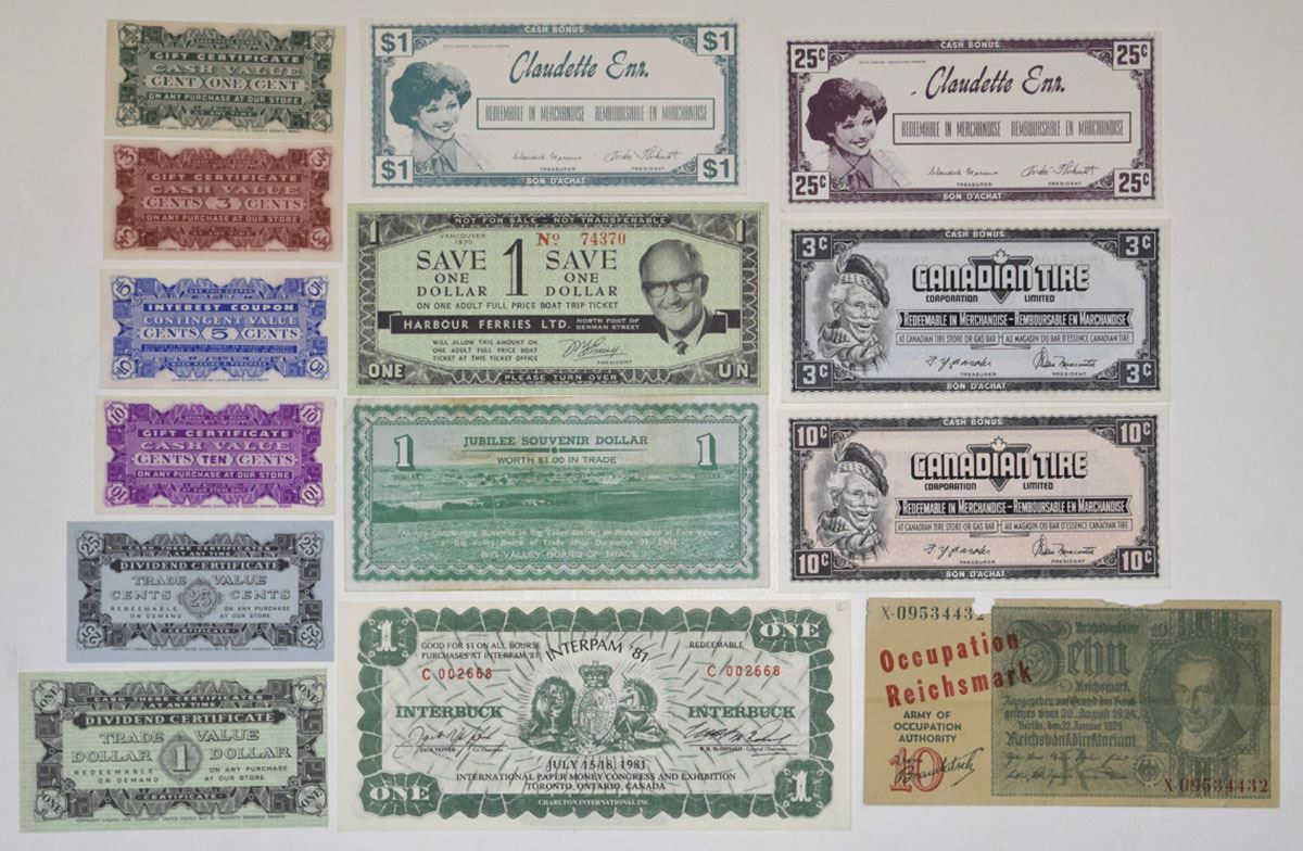 Canada, ca.1920-60s. Lot of 14 Advertising and Obsolete Banknotes, Includes: Canadian Tire Corp. Ltd., 3 cts and 10 cts, Unc. (2); 1964, Big Valley, Alberta, Golden Memories Souvenir Dollar, $1,VF-XF; Harbour Ferries Ltd Dollar Coupon, Vancouver, 1970, $1, Unc.; Claudette Enr. Cash Bonus Certificates (2), 25 cts and $1, English and French, Uncirculated; 1927, Liphardt Hardware Ltd Gift Certificates, 10 ct, 25 ct, and $1, AU-Unc (3); Fake Reichsmark with Political Message for War Bonds on back; and, 1981, Ontario, Canada, $1, Interpam '81 Interbuck. Pieces range from Fine to CU condition. (14). Sold "AS IS" no returns accepted.