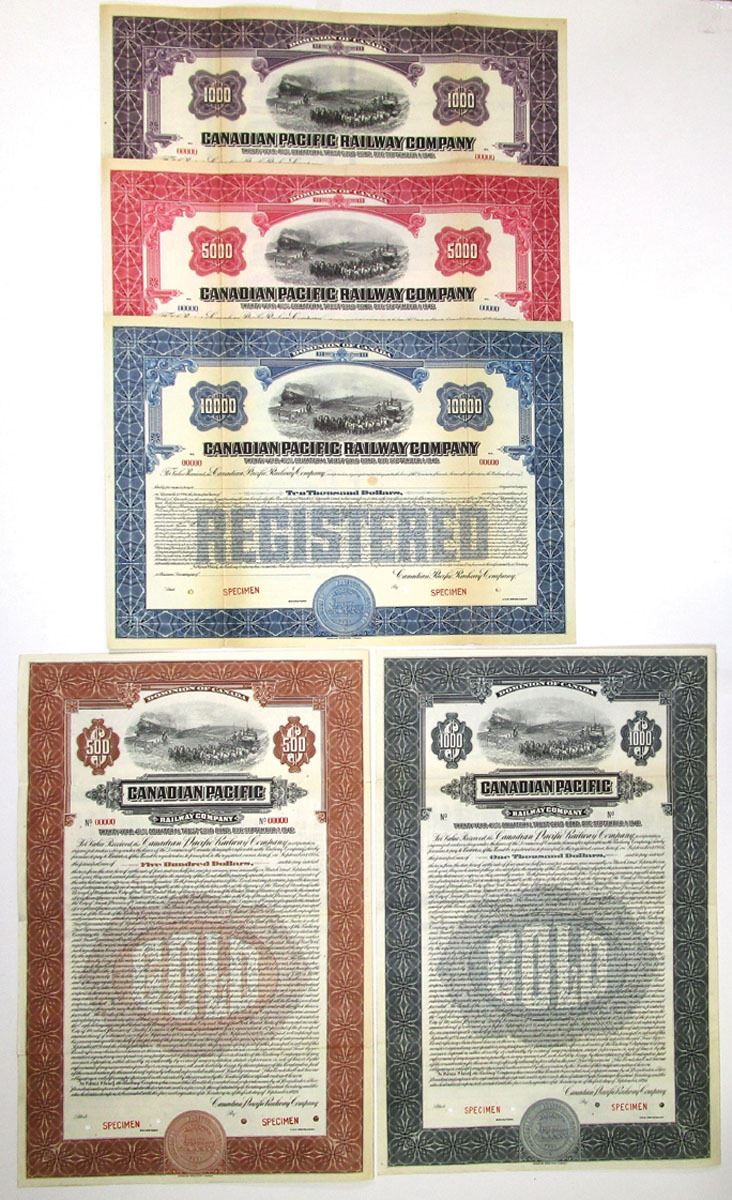 Canada, 1926, Lot of 5 Specimen Bonds, Includes: $500 4 1/2% Twenty Year Collateral Trust Gold Coupon Bond, Black with brown border;$1000 4 1/2% Twenty Year Collateral Trust Gold Coupon Bond, Black with steel gray border; $1000 Registered 4 1/2% Twenty Year Collateral Trust Gold Bond, Black with purple border; $5000 Registered 4 1/2% Twenty Year Collateral Trust Gold Bond, Black with red border; $10,000 Registered 4 1/2% Twenty Year Collateral Trust Gold Bond, Black with blue border. All have same vignette of train passing ranchers with horses at top center, Specimen overprints, POCS, are in VF to XF condition with archival reinforcements, printed by ABNC. (5). Sold "AS IS" no returns accepted.