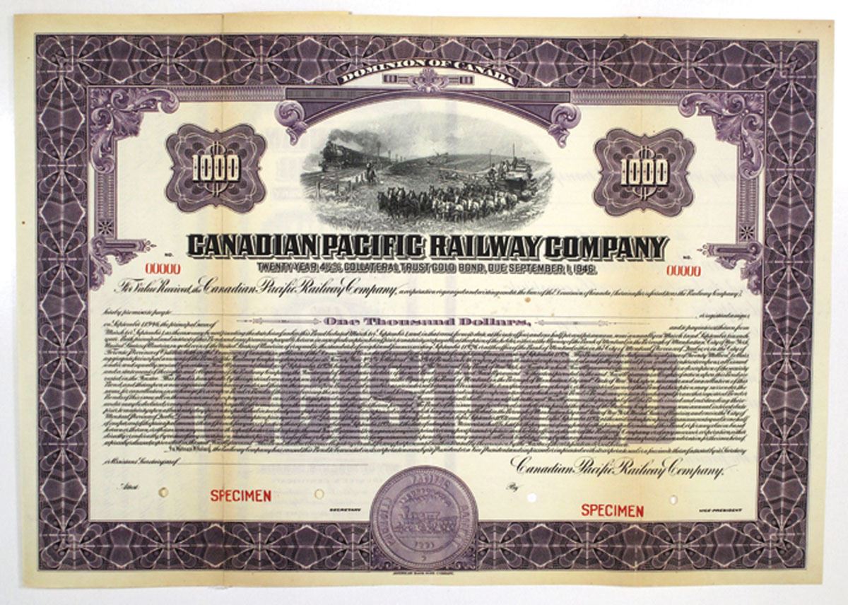 Canada, 1926, Lot of 5 Specimen Bonds, Includes: $500 4 1/2% Twenty Year Collateral Trust Gold Coupon Bond, Black with brown border;$1000 4 1/2% Twenty Year Collateral Trust Gold Coupon Bond, Black with steel gray border; $1000 Registered 4 1/2% Twenty Year Collateral Trust Gold Bond, Black with purple border; $5000 Registered 4 1/2% Twenty Year Collateral Trust Gold Bond, Black with red border; $10,000 Registered 4 1/2% Twenty Year Collateral Trust Gold Bond, Black with blue border. All have same vignette of train passing ranchers with horses at top center, Specimen overprints, POCS, are in VF to XF condition with archival reinforcements, printed by ABNC. (5). Sold "AS IS" no returns accepted.