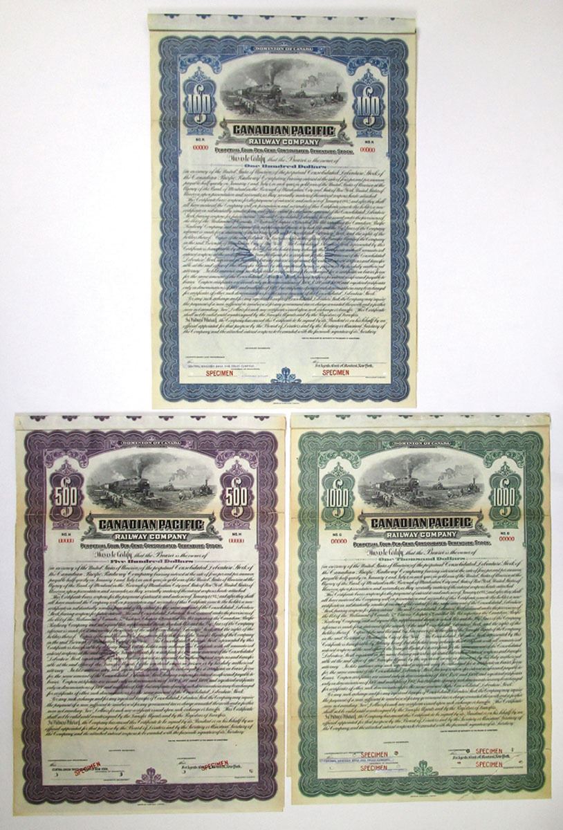 Canada, ND (1920s), Lot of 3 Specimen Bonds, Includes: $100 4% Perpetual Consolidated Debenture Stock Coupon Bond, Black with blue border; $500 4% Perpetual Consolidated Debenture Stock Coupon Bond, Black with purple border; $1000 4% Perpetual Consolidated Debenture Stock Coupon Bond, Black with green border. All have vignette of train passing farmers at top center, Specimen overprints, POCs, are in Good to Fine condition with archival reinforcements, printed by ABNC. (3). Sold "AS IS" no returns accepted.