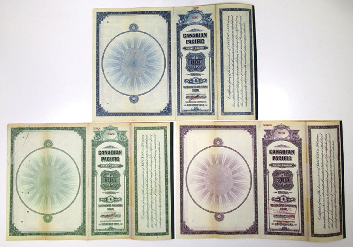 Canada, ND (1920s), Lot of 3 Specimen Bonds, Includes: $100 4% Perpetual Consolidated Debenture Stock Coupon Bond, Black with blue border; $500 4% Perpetual Consolidated Debenture Stock Coupon Bond, Black with purple border; $1000 4% Perpetual Consolidated Debenture Stock Coupon Bond, Black with green border. All have vignette of train passing farmers at top center, Specimen overprints, POCs, are in Good to Fine condition with archival reinforcements, printed by ABNC. (3). Sold "AS IS" no returns accepted.
