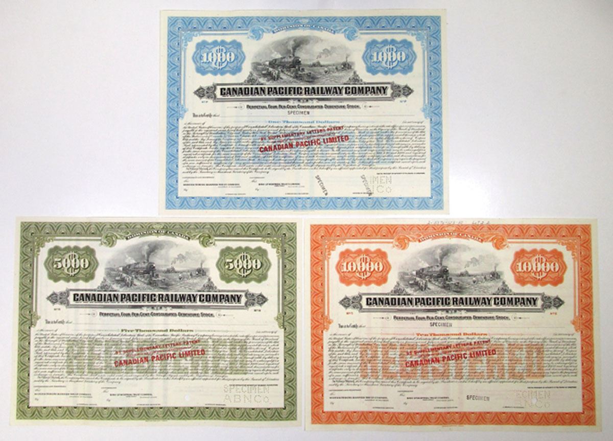 Canada, 1922 certificate Reissued in 1968, Lot of 3 Specimen Bonds, Includes: $1000 Registered 4% Perpetual Consolidated Debenture Stock Bond, Black with blue border; $5000 Registered 4% Perpetual Consolidated Debenture Stock Bond, Black with green border; $10,000 Registered 4% Perpetual Consolidated Debenture Stock Bond, Black with orange border. All have "By supplementary letters patented the name of the company have been changed to Canadian Pacific Ltd." stamps on face, are pin punched Specimen, in XF condition, printed by ABNC. (3). The Canadian Pacific Railway Company officially changed its name to Canadian Pacific Ltd. in 1968. This change reflected the company’s diversification beyond its original rail transportation business, as it expanded into other areas such as shipping, hotels, and telecommunications. The name change symbolized a broader corporate identity that was no longer solely tied to railroads.