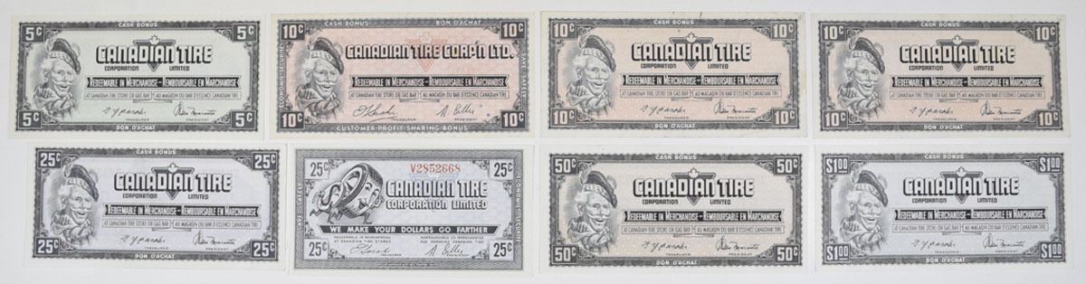 Canada, 1950-60s. Lot of 8 Issued Scrip Notes, Includes: 5 Cents, 10 Cents (3), 25 Cents, 50 Cents, and $1 - all with milling mustached man at left, Also includes 25 cent scrip note with tire and change at left. VF to CU condition. (8). Canadian Tire Corporation, Limited is a Canadian retail company which operates in the automotive, hardware, sports, leisure and housewares sectors. Canadian Tire money, officially Canadian Tire 'money' or CTM, is a loyalty program operated by the Canadian retail chain Canadian Tire. It consists of coupons, issued by the company, which resemble real banknotes. It can be used as scrip in Canadian Tire stores, but is not considered a private currency. The notes are printed on paper similar to what Canadian currency was printed on when they were still paper, and were jointly produced by two of the country's long-established security printers, British American Banknote Company (BABN) and Canadian Bank Note Company (CBN). Some privately owned businesses in Canada accept CTM as payment, since the owners of many such businesses shop at Canadian Tire. In Canadian Tire stores, CTM is accepted for Canadian money at par, i.e.; 1 Canadian Tire Dollar = 1 Canadian Dollar.