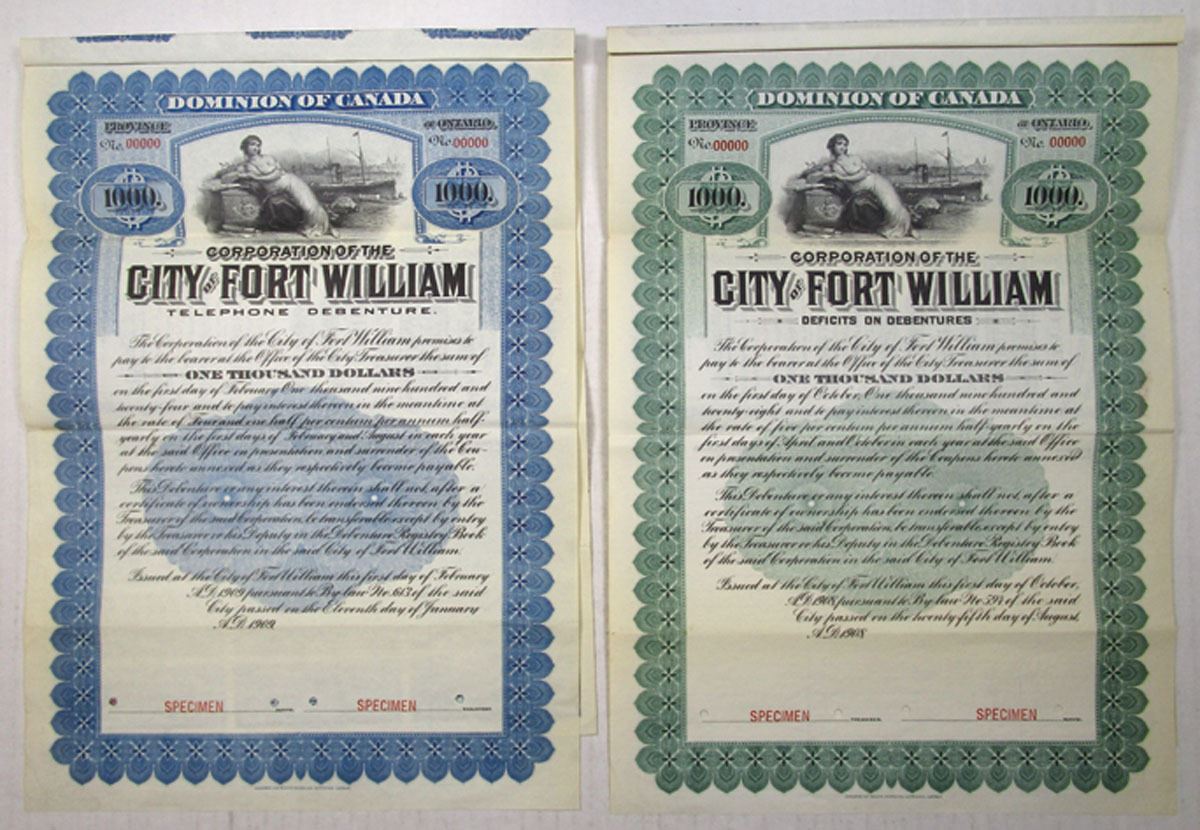 Fort Williams, Ontario, Canada, 1908 & 1909. Lot of 2 Specimen Bonds, Includes: $1000 Specimen 4 1/2% Debenture Coupon Bond, Black print on green border and underprint; $1000 Specimen 4 1/2% Coupon Bond, Black print on blue border and underprint. Both bonds have Image of reclining allegorical woman at top, Specimen overprints and POC's, are in VF to XF condition, printed by ABNC. (2). Sold "AS IS" no returns accepted.