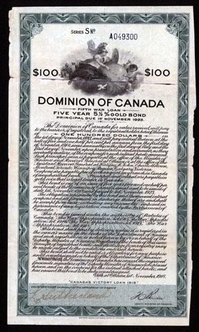 Ottawa, Canada. Nov. 1, 1918. Series S. $100. 5 Year, 5 1/2% Gold Bond. Principal Due 1923. Issued and uncancelled War bond. Green border. Allegorical woman, cherub and globe with owl and dove. No coupons attached. Extremely rare Canadian War Bond. VG to Fine with edge wear and small spits at folds.