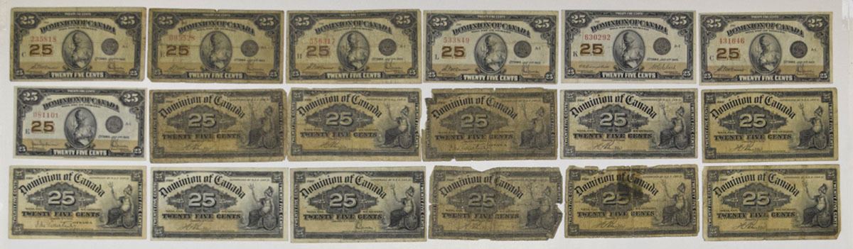 Canada, 1900-23. Lot of 18 Issued Banknotes, Includes: 1900, 25 Cents, P-9a (2), P-9b (8), and P-9c, ABNC; 1923, 25 Cents, P-11a, P-11b (5), and P-11c, CBNC. Notes range from Good to VF condition. (18). Sold "AS IS" no returns accepted.
