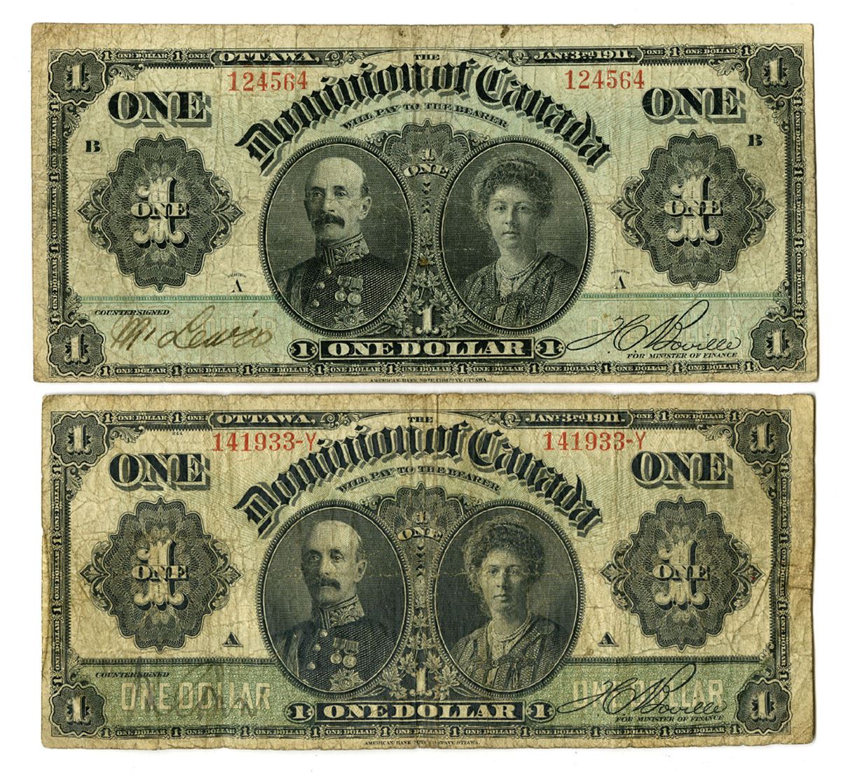 Canada, 1911. 1 Dollar, P-27a and P-27b, Issued Banknote Pair, Black on green underprint with portrait of Earl and Countess of Grey (Governor General) at center, Back is green with Parliament building at center, S/Ns 124564 and 141933-Y, Notes range from Choice Fine to VF condition. ABNC-Ottawa. (2). Sold "AS IS" no returns accepted.
