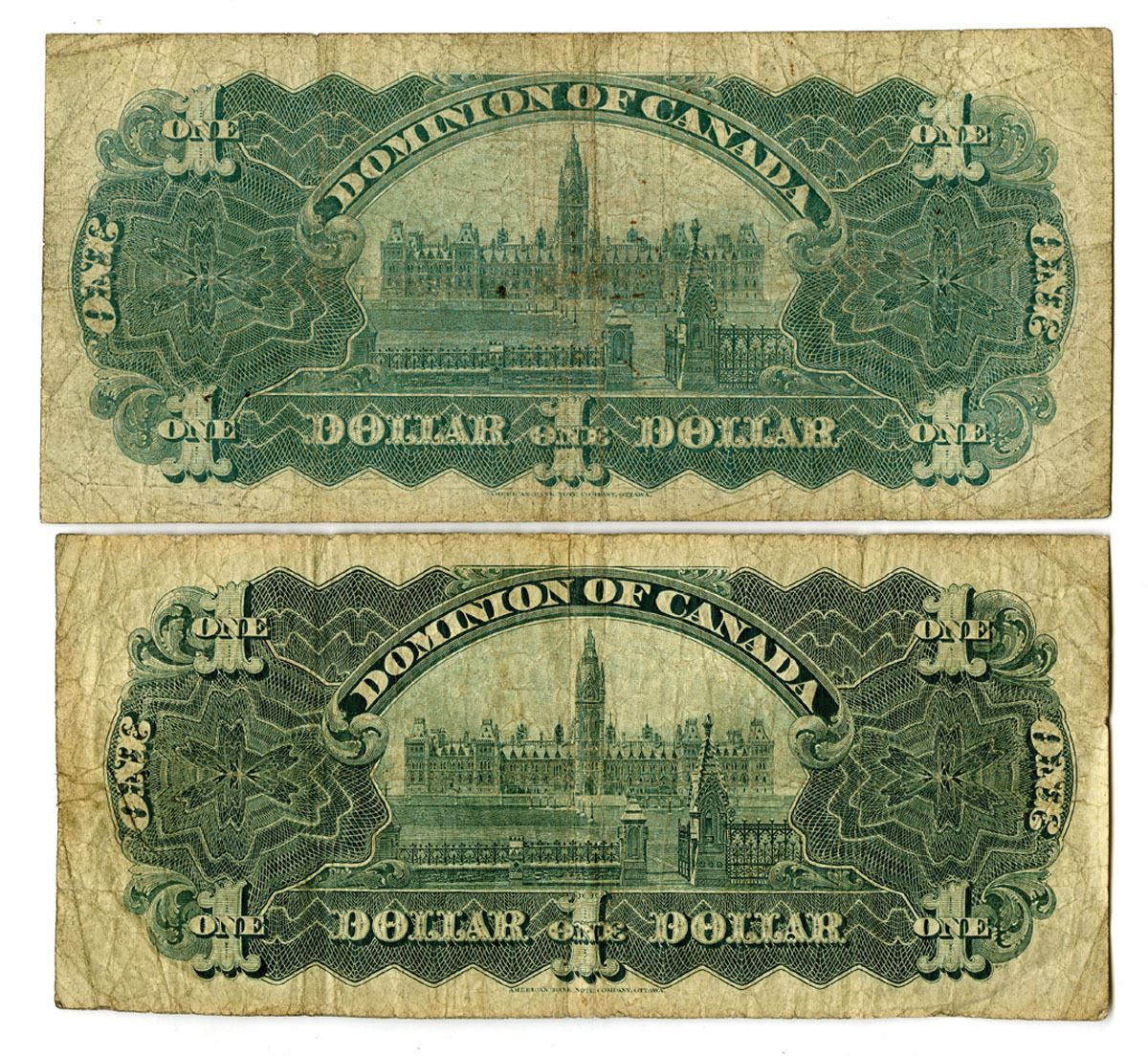 Canada, 1911. 1 Dollar, P-27a and P-27b, Issued Banknote Pair, Black on green underprint with portrait of Earl and Countess of Grey (Governor General) at center, Back is green with Parliament building at center, S/Ns 124564 and 141933-Y, Notes range from Choice Fine to VF condition. ABNC-Ottawa. (2). Sold "AS IS" no returns accepted.