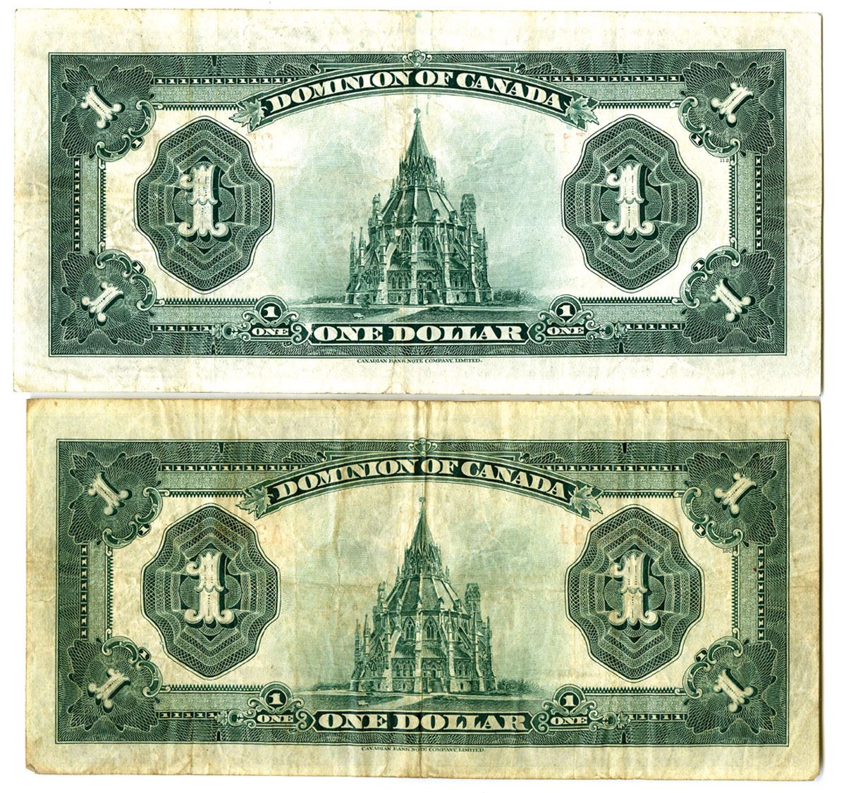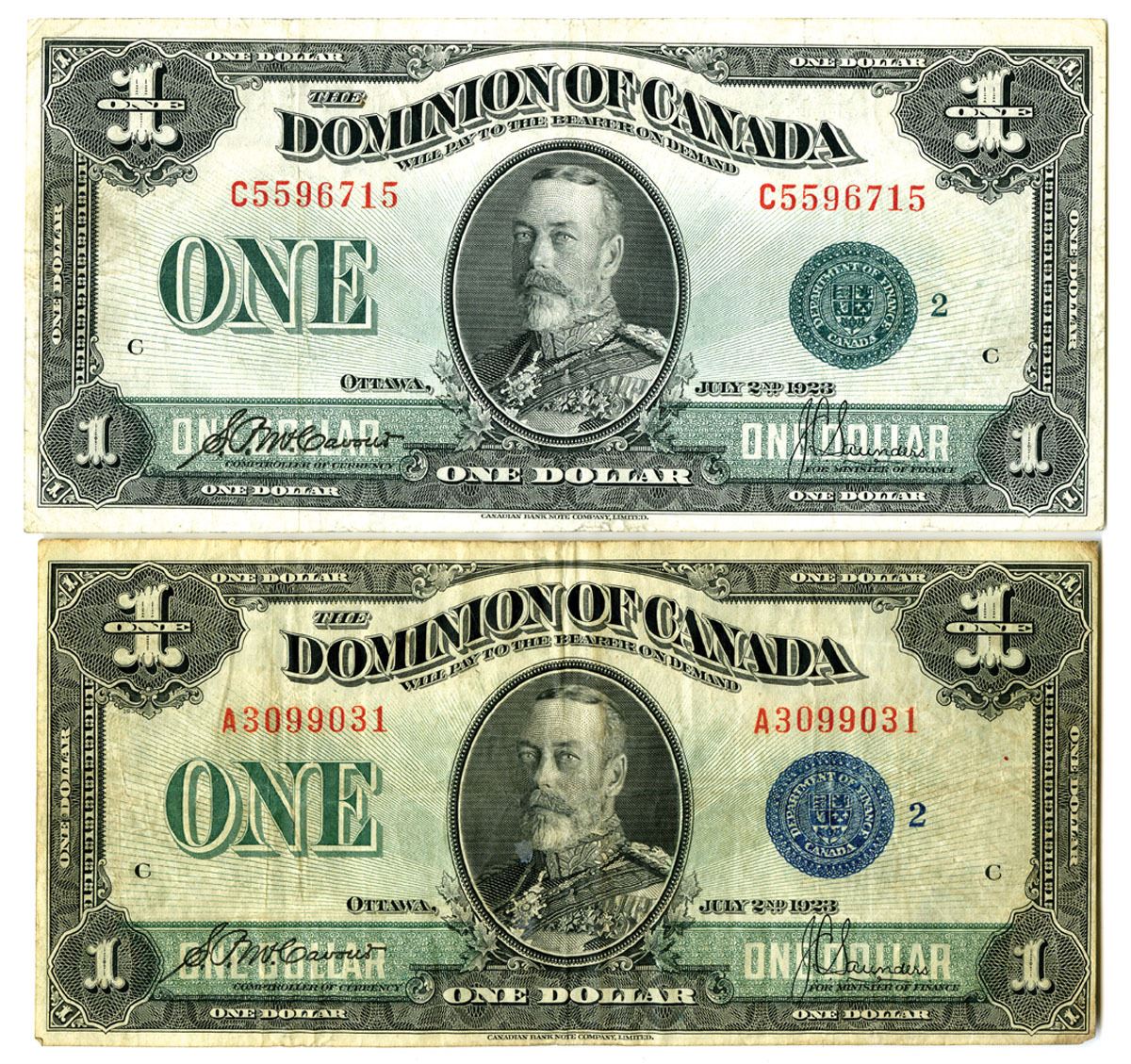 Canada, 1923. 1 Dollar, P-33h, Blue Seal-2A, VF; and, P-33j, Green Seal-2C, Choice VF, Issued Banknote Pair, Black on green underprint with portrait of King George V at center, Back is green with Library of Parliament at center, S/Ns A3099031 and C5596715, CBNC. (2). Sold "AS IS" no returns accepted.