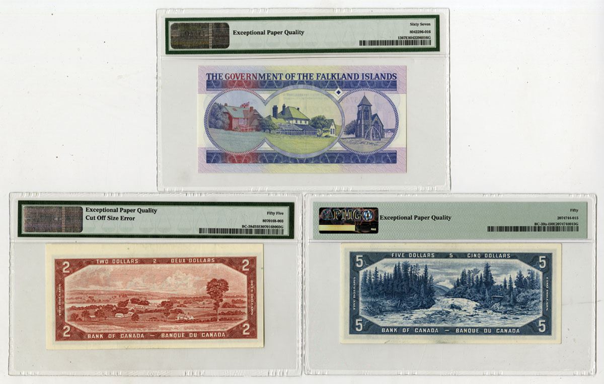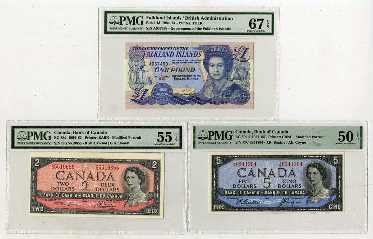 Canada & Falkland Islands, Lot of 3 Issued Banknotes, Includes: 1954, Bank of Canada $2, P-76d, BC-38d, with modified portrait of Queen Elizabeth II at right, S/N P/G 5519655, PMG graded About Unc 55 EPQ with comment "Cut Off Size Error," BABN; 1954, $5, P-77a, BC-39a-i, with modified portrait of Queen Elizabeth II at right, S/N X/C 6241304, PMG graded About Unc 50 EPQ, CBNC; and, Government of the Falkland Islands £1 Pound, P-13, Issued banknote, Blue on multicolor underprint, S/N A057469, PMG graded Superb Gem Uncirculated 67 EPQ. Printer: TDLR. (3). Sold "AS IS" no returns accepted.